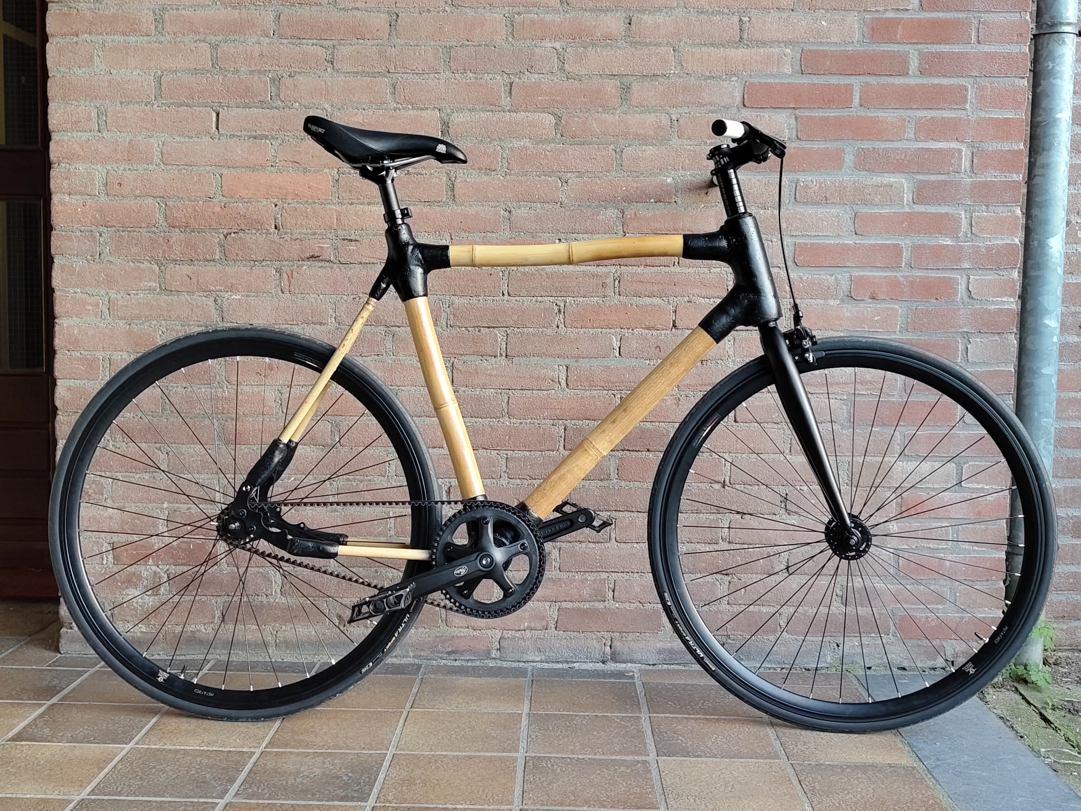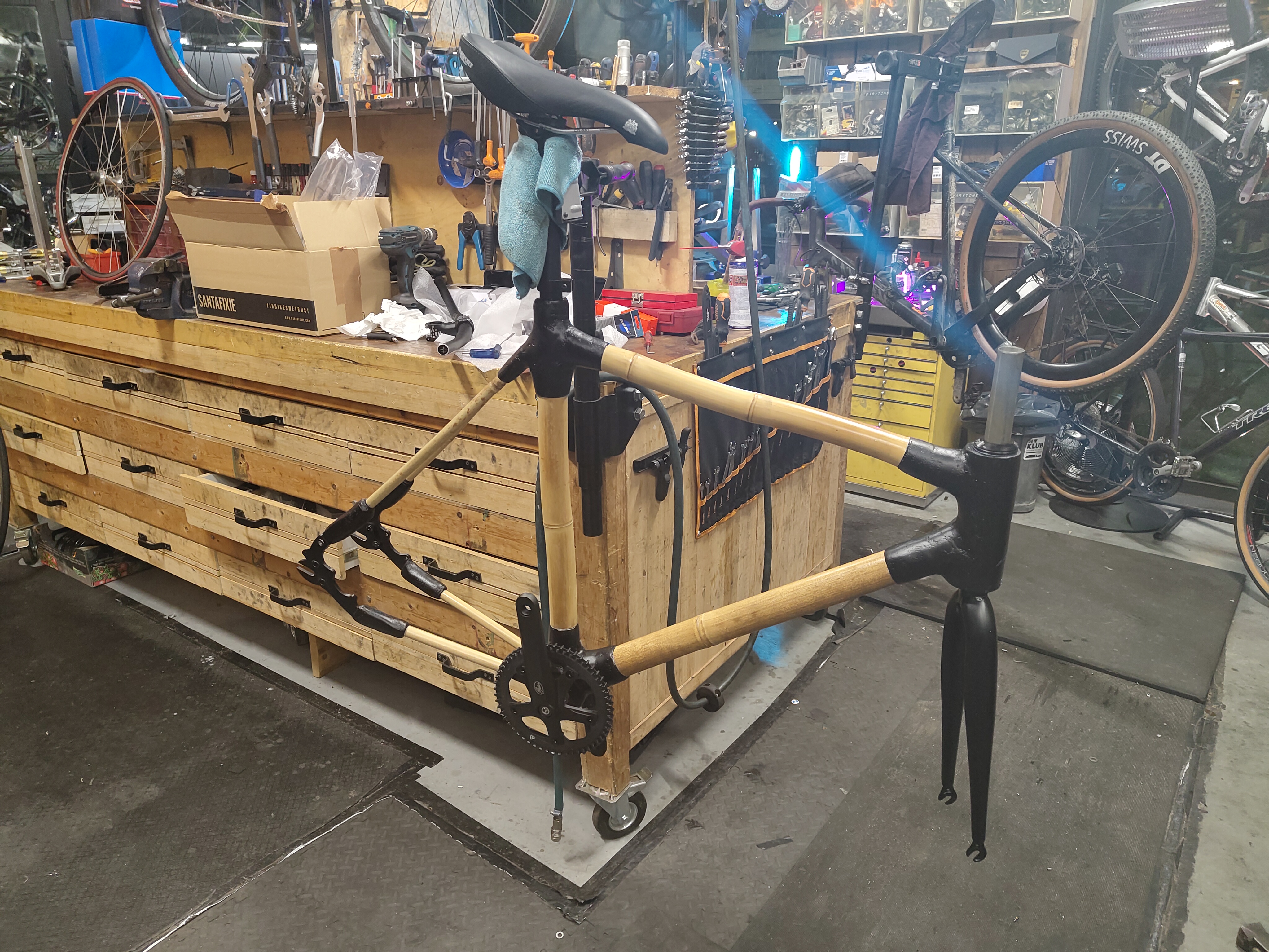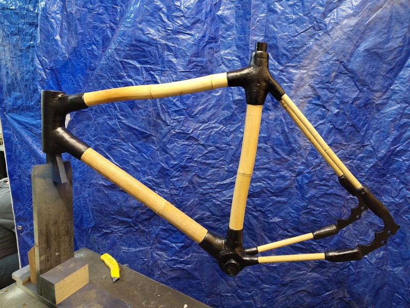 My gravel bike built from bamboo culms, joined with flax and epoxy resin at the nodes. Assembled at a Bamboo Bicycle Club workshop and completely hand finished in spare time.