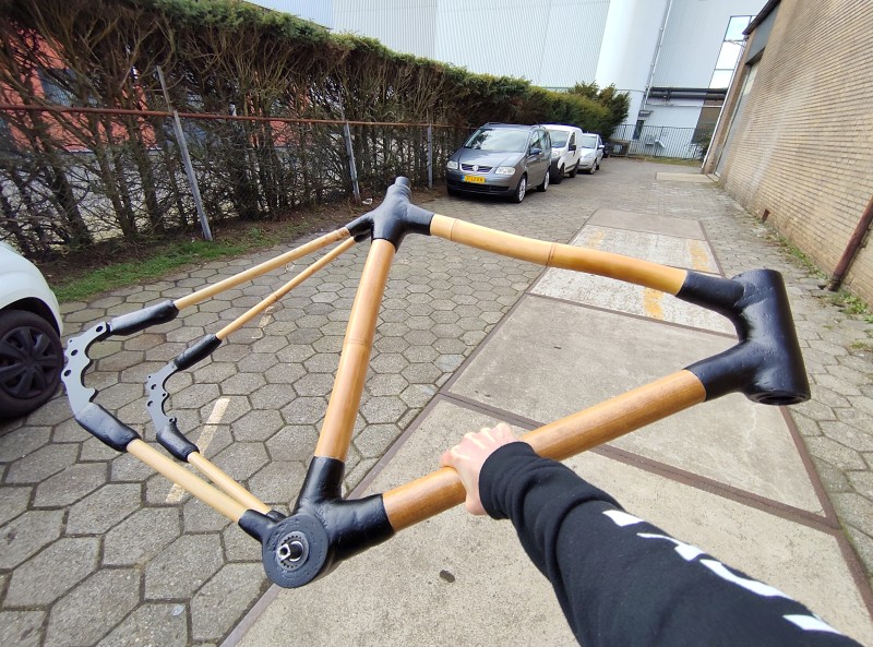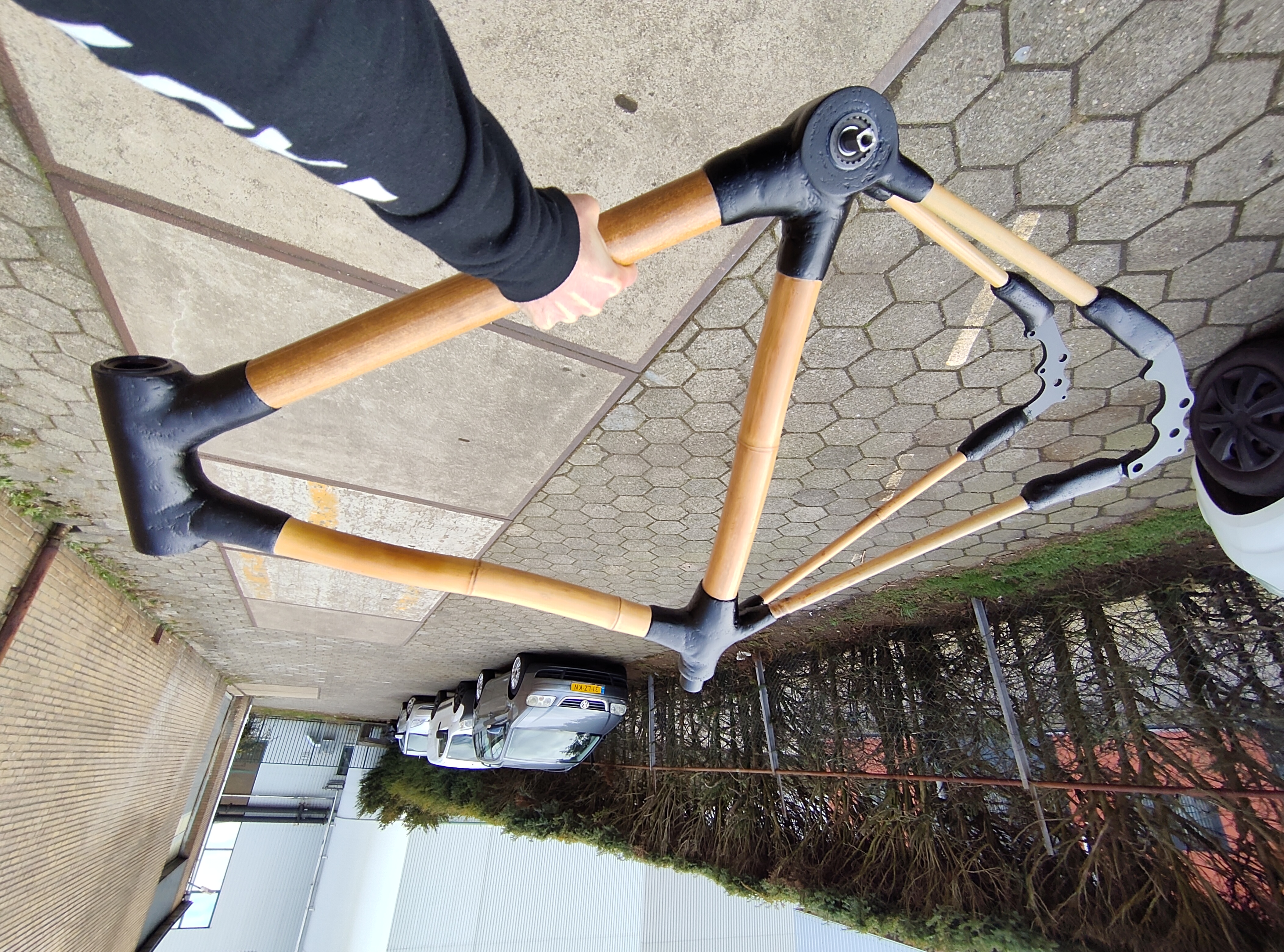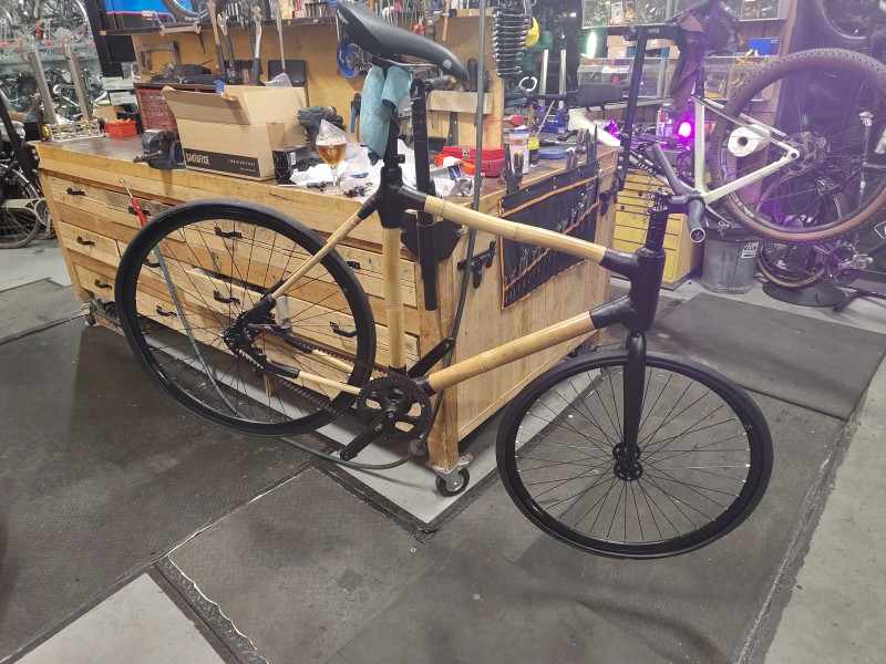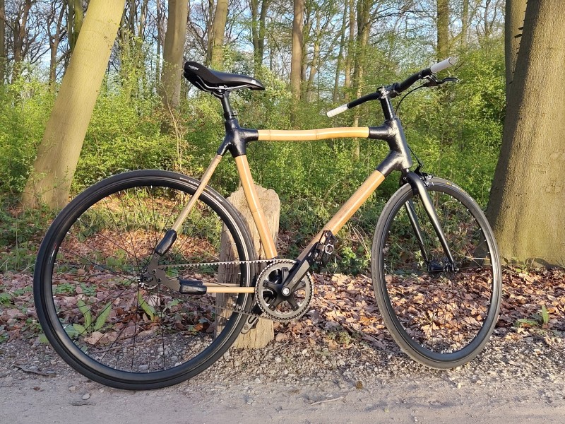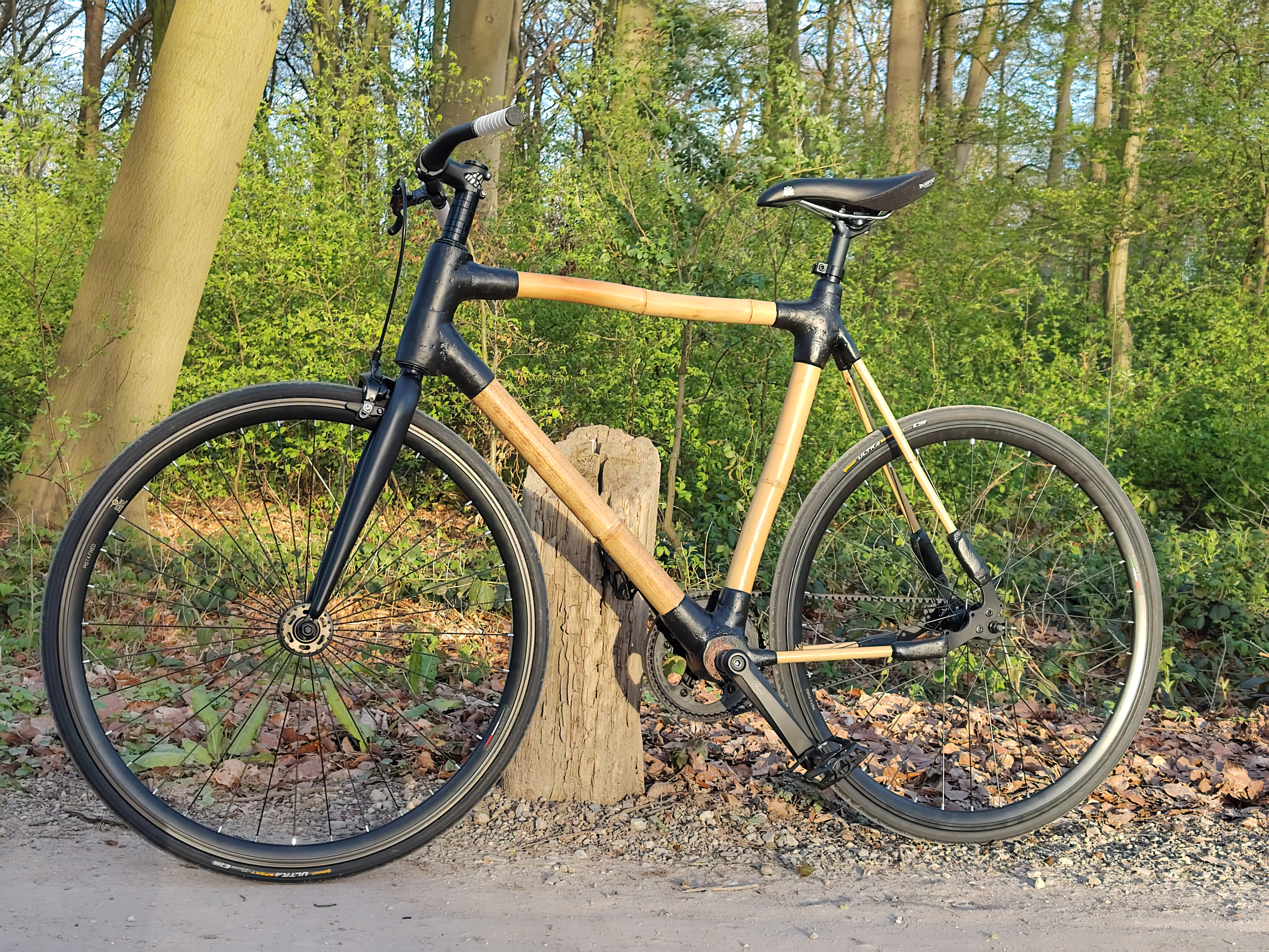 My gravel bike built from bamboo culms, joined with flax and epoxy resin at the nodes. Assembled at a Bamboo Bicycle Club workshop and completely hand finished in spare time.